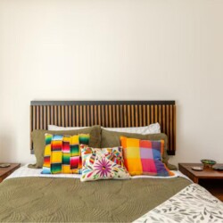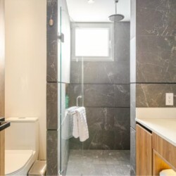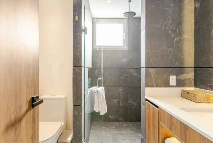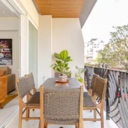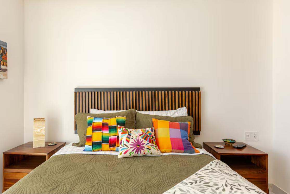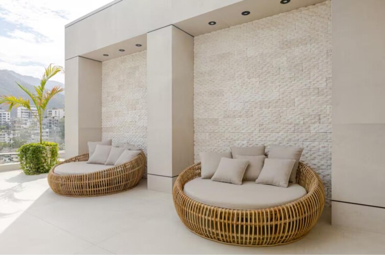 The apartment has a living room, dining room, kitchen, and complete laundry center. A master suite with king bed and private bathroom. A second room with queen bed and private bathroom. Both bedrooms have access to a balcony. The building rooftop has a pool, deck, and lounging area.